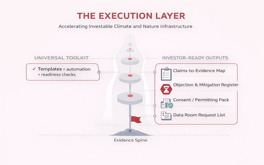We turn complex climate, nature and infrastructure opportunities into deliverable, investable pipelines. We focus on the friction points that slow projects down: evidence, governance, permitting, grid and water constraints, claims credibility, and investor readiness.